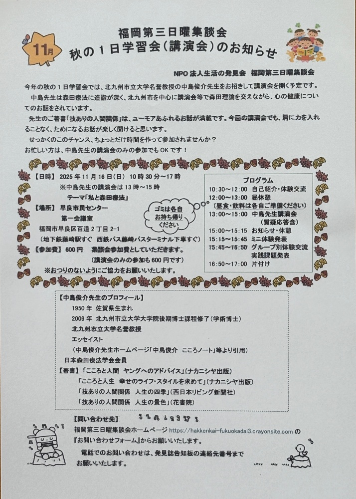中島先生の講演会資料の準備の関係で、1日学習会に出席しようと思われる方は、10月15日までに、『ホームページお問い合わせフォーム』にてお知らせいただけるとありがたく存じます。